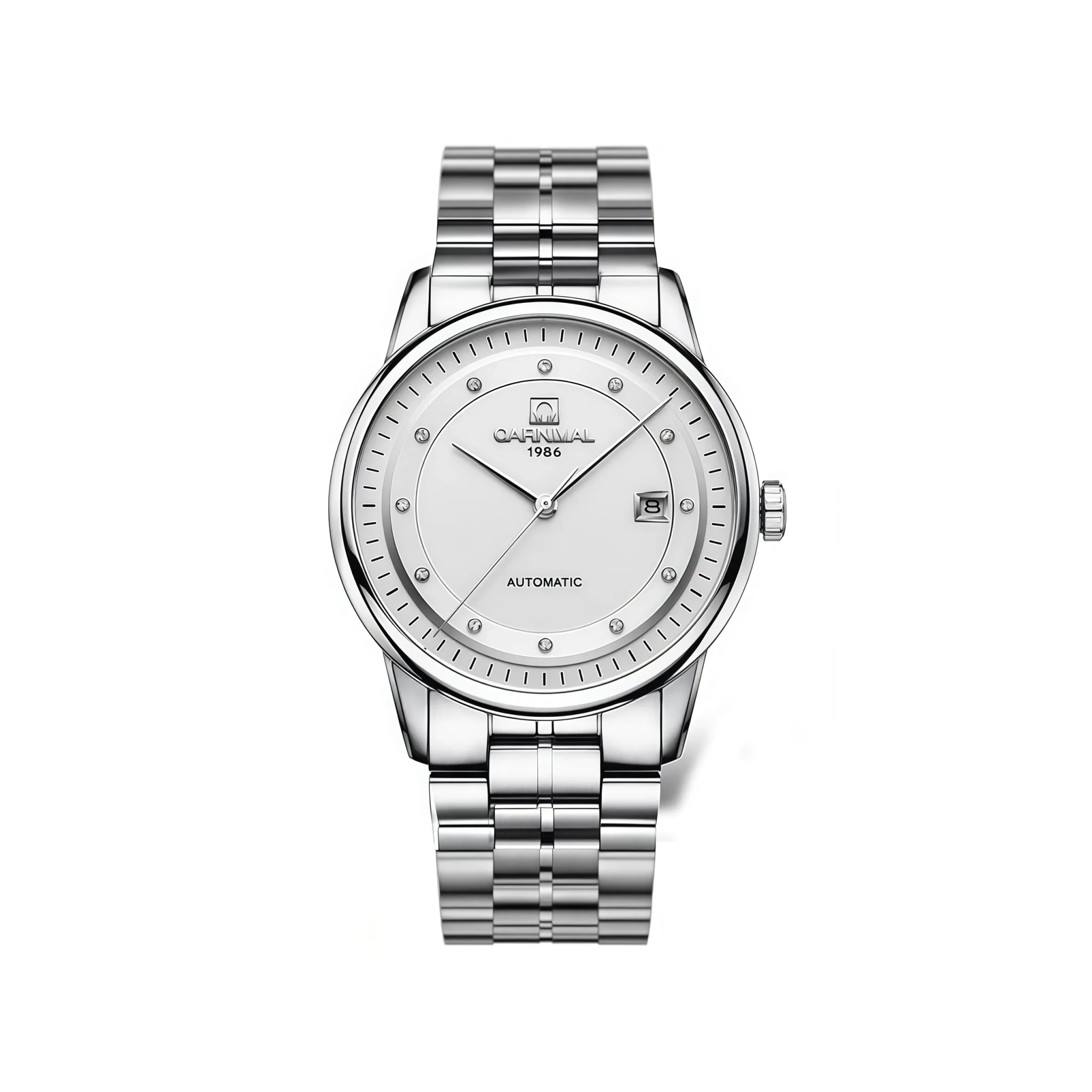 Phần mặt kính được trang bị kính Sapphire – loại kính cao cấp sở hữu khả năng chống trầy xước vượt trội gần như “không thể xước trong điều kiện sử dụng bình thường”. Màu chủ đạo mà Carnival chọn cho phiên bản này là bạc kết hợp với mặt số trơn màu trắng hoặc vàng nhạt, đi cùng cọc số đơn giản – giúp tổng quan đồng hồ trông nhã nhặn, dễ phối đồ mà vẫn thu hút ánh nhìn.