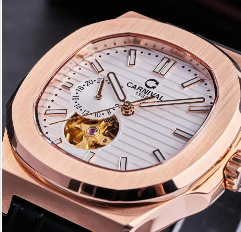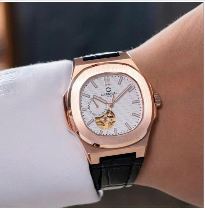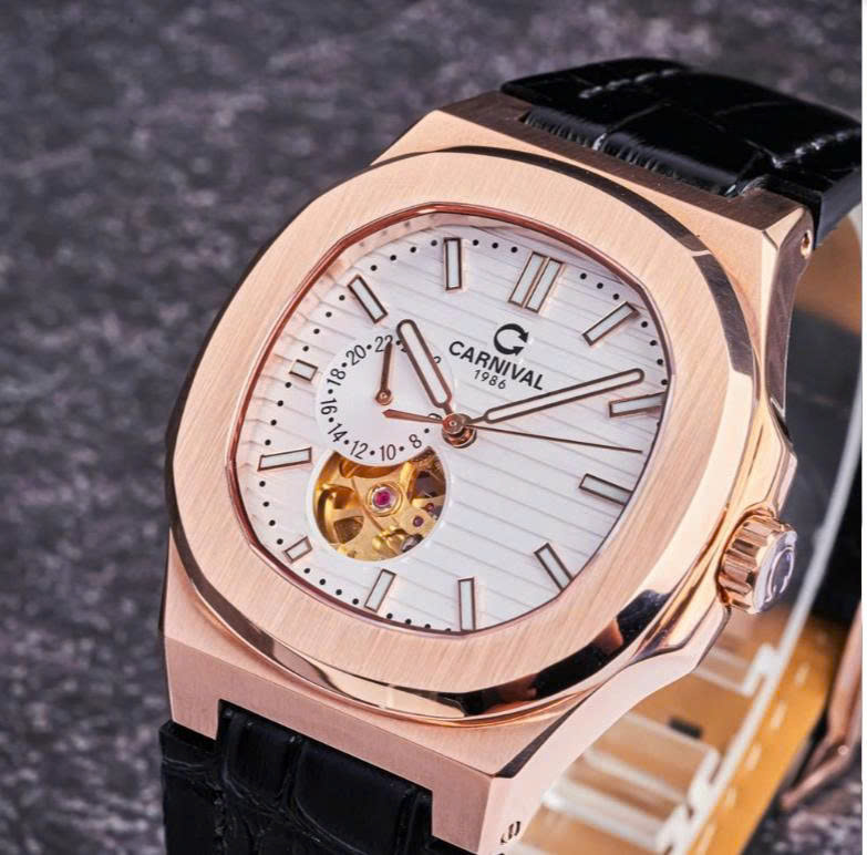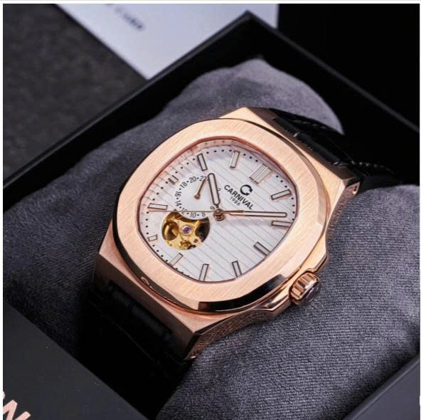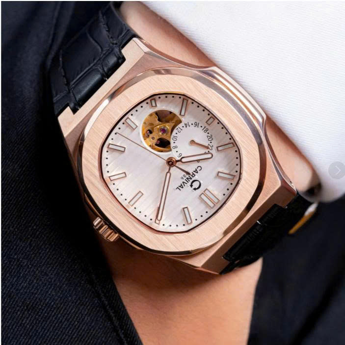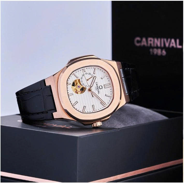 Carnival 8159G-VH-DD-T là mẫu đồng hồ cơ nam mang phong cách hiện đại pha trộn giữa tính thể thao mạnh mẽ và sự tinh tế cổ điển. Dễ dàng nhận thấy điểm nhấn nổi bật nhất trong thiết kế chính là mặt số kiểu open heart – khoe khéo phần bánh răng chuyển động bên trong bộ máy cơ. Đây không chỉ là điểm nhấn về mặt thẩm mỹ, mà còn thể hiện đẳng cấp cơ khí rất riêng của dòng đồng hồ automatic.