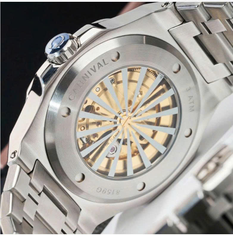 Carnival 8159G-VT-D sử dụng bộ máy cơ tự động (Automatic) đến từ Nhật Bản – nơi nổi tiếng với công nghệ đồng hồ chính xác và bền bỉ. Ưu điểm lớn của dòng máy này là không cần thay pin, mà hoạt động dựa trên chuyển động tự nhiên của cổ tay người đeo.