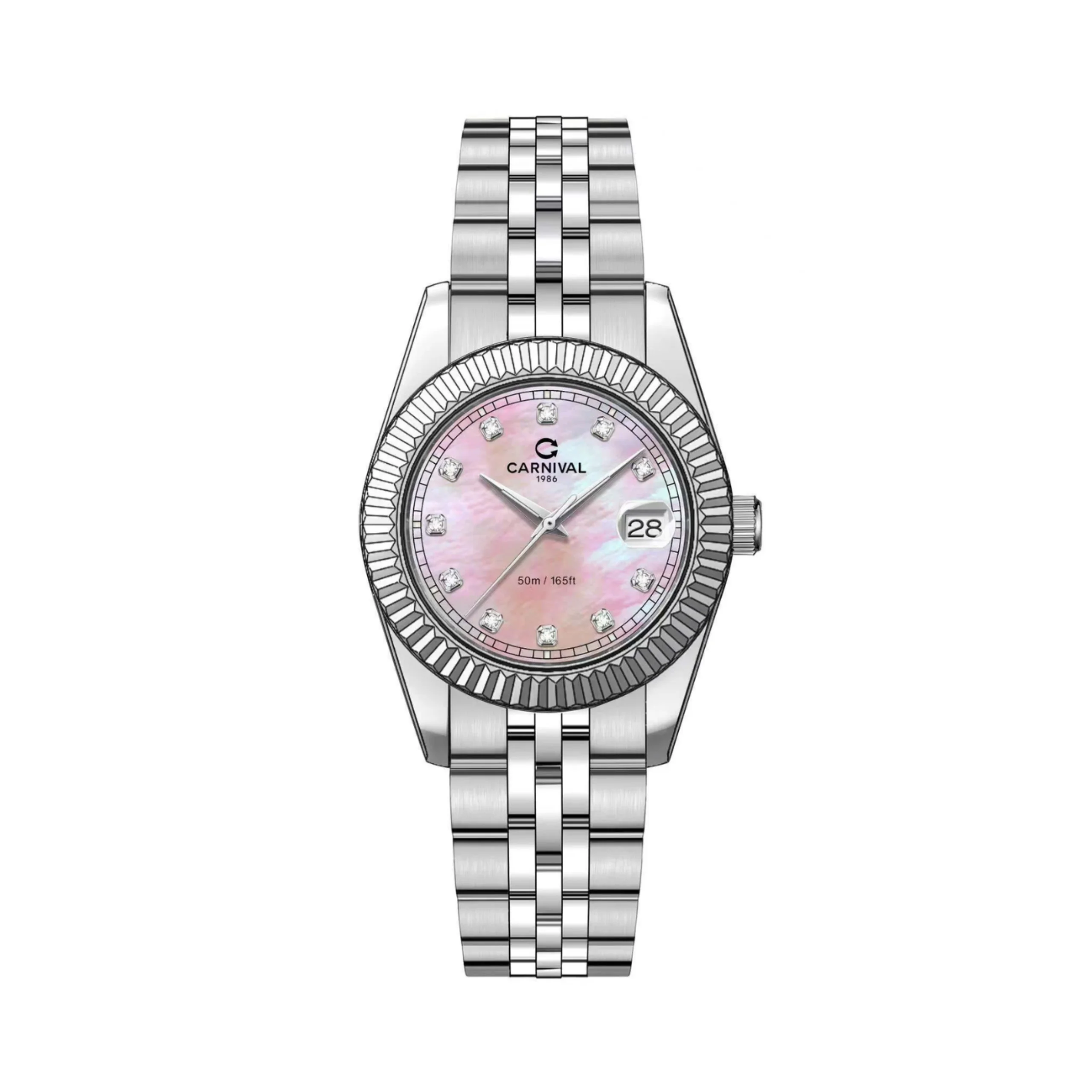 Nổi bật với mặt số nhỏ gọn khoảng 30–31mm – kích thước lý tưởng cho cổ tay nữ giới Việt Nam – mẫu đồng hồ ghi điểm bởi sự thanh lịch và nữ tính. Viền benzel chế tác dạng “răng cưa”, được lấy cảm hứng từ thiết kế Rolex Datejust nổi tiếng, góp phần tạo nên vẻ ngoài sang trọng nhưng không phô trương. Mặt số còn được đính đá lấp lánh, mang lại điểm nhấn nhẹ nhàng, quý phái.