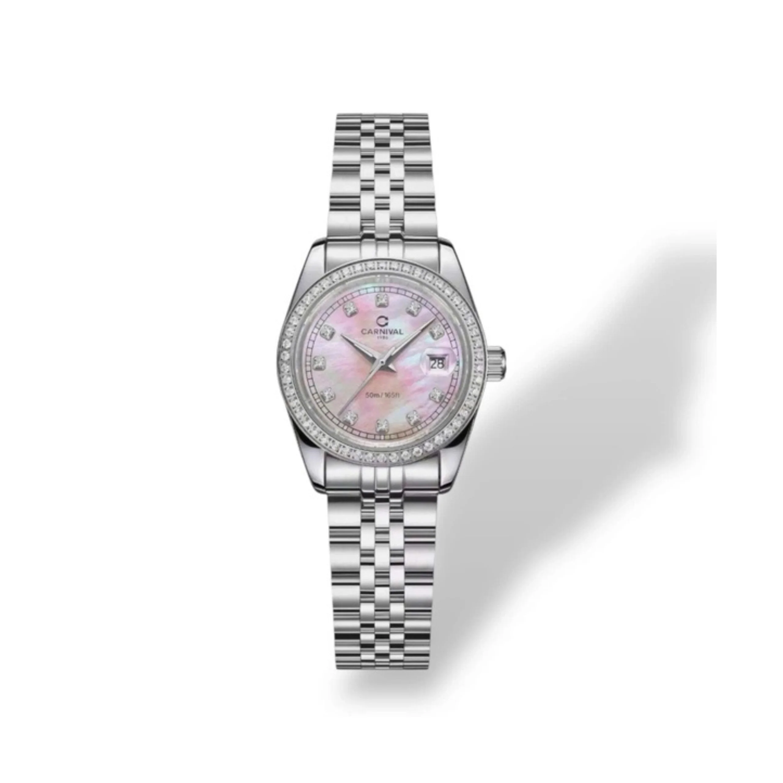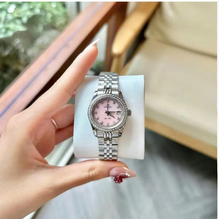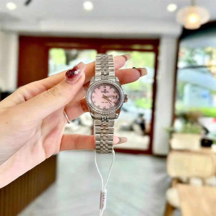 Về mặt kính, CARNIVAL trang bị kính sapphire cao cấp – một điểm cộng lớn trong tầm giá. Đây là loại kính nổi tiếng với khả năng chống trầy gần như tuyệt đối, thường chỉ xuất hiện trên những mẫu đồng hồ cao cấp hơn. Kết hợp cùng màu sắc chủ đạo là bạc sáng với các điểm nhấn mạ vàng hoặc vàng hồng trên viền, kim và cọc số, tổng thể của chiếc đồng hồ toát lên vẻ sang trọng, hài hòa và rất dễ phối trang phục.