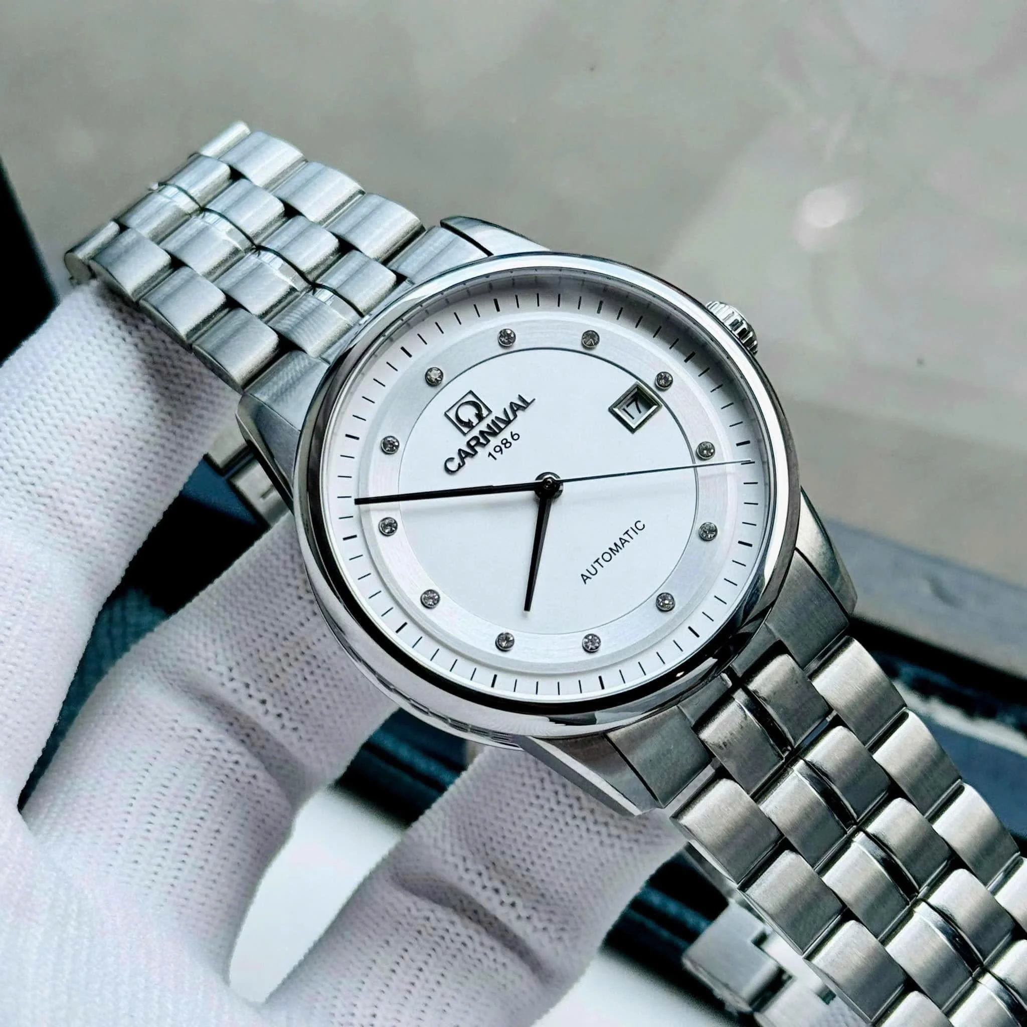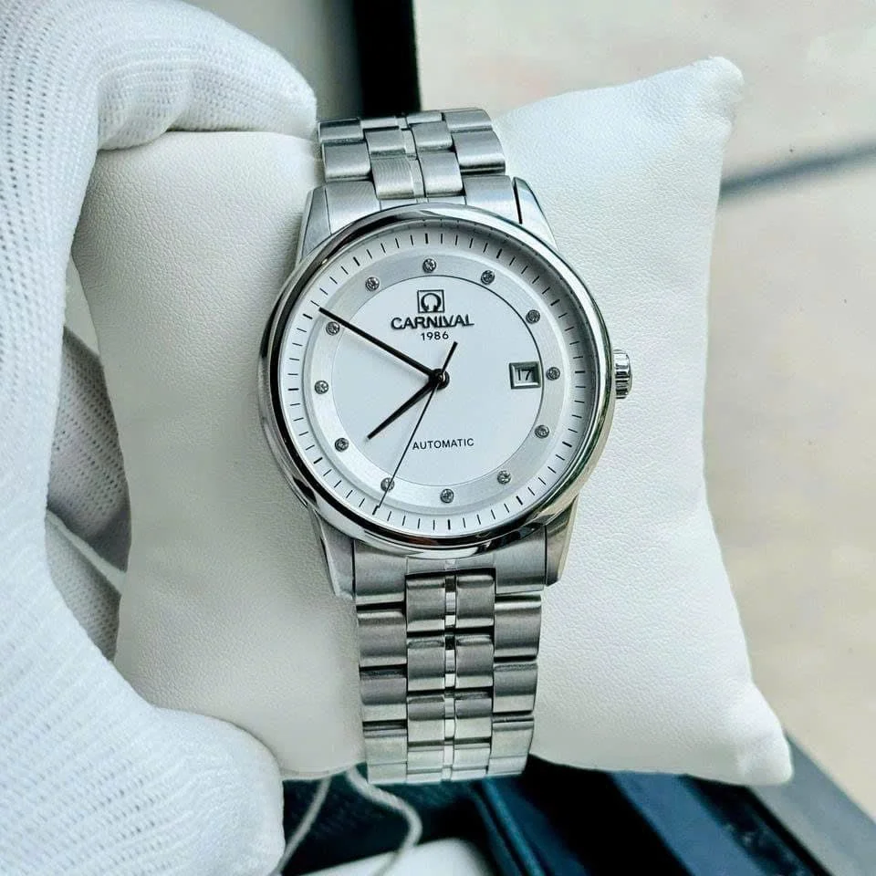 Phần mặt kính được trang bị kính Sapphire – loại kính cao cấp sở hữu khả năng chống trầy xước vượt trội gần như “không thể xước trong điều kiện sử dụng bình thường”. Màu chủ đạo mà Carnival chọn cho phiên bản này là bạc kết hợp với mặt số trơn màu trắng hoặc vàng nhạt, đi cùng cọc số đơn giản – giúp tổng quan đồng hồ trông nhã nhặn, dễ phối đồ mà vẫn thu hút ánh nhìn.